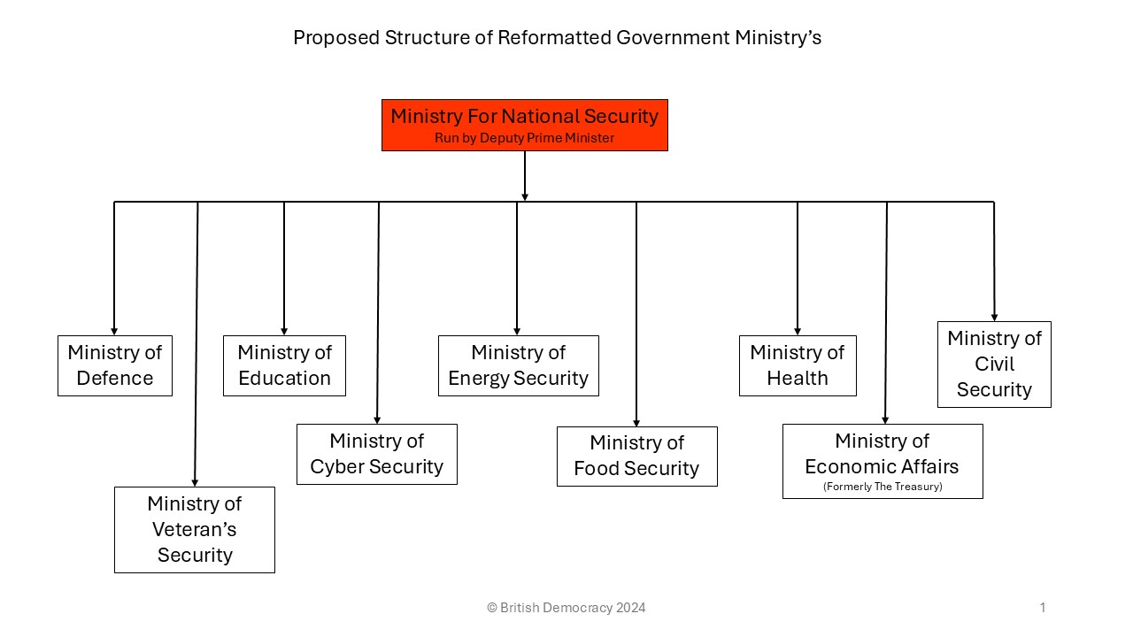 It is the intention of British Democracy to create a Minsistry of National Security – this will be headed by the Deputy Prime Minister and will be the executive Ministry in charge of any agency that impacts National Security.