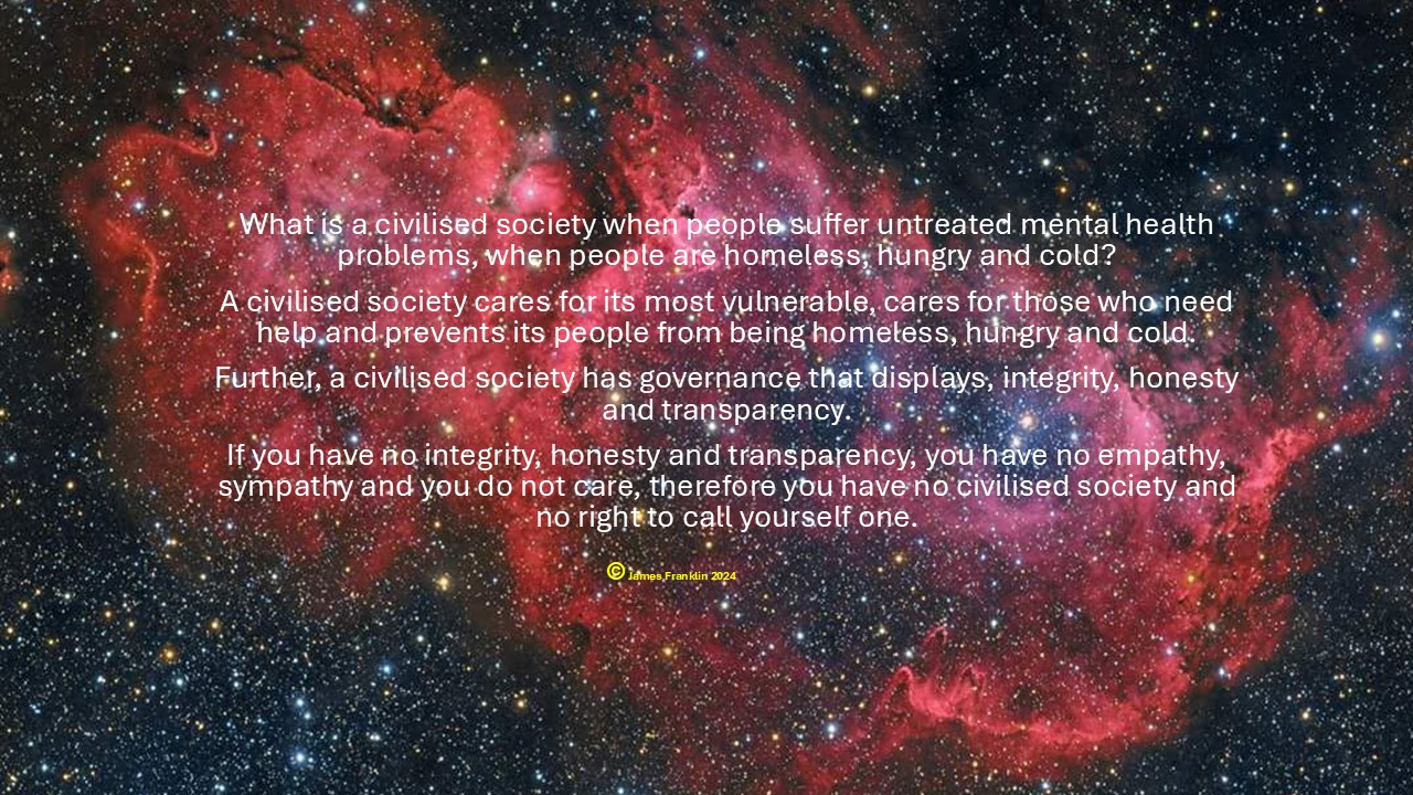 The concept of a “civilised society” typically hinges on the well-being of its citizens, the ethicality of its legal and political systems, as well as the transparency if its governance. By these measures, a civilised society ensures that its people have access to fundamental human rights, such as mental health support, secure housing, and fair justice. A government’s first priority is to the safety of its population, and that mental health, as well as physical health, should be at the forefront of their delivery of “national security” but they must also demonstrate integrity, empathy, sympathy and honesty, and its operations must remain fully open to public scrutiny.